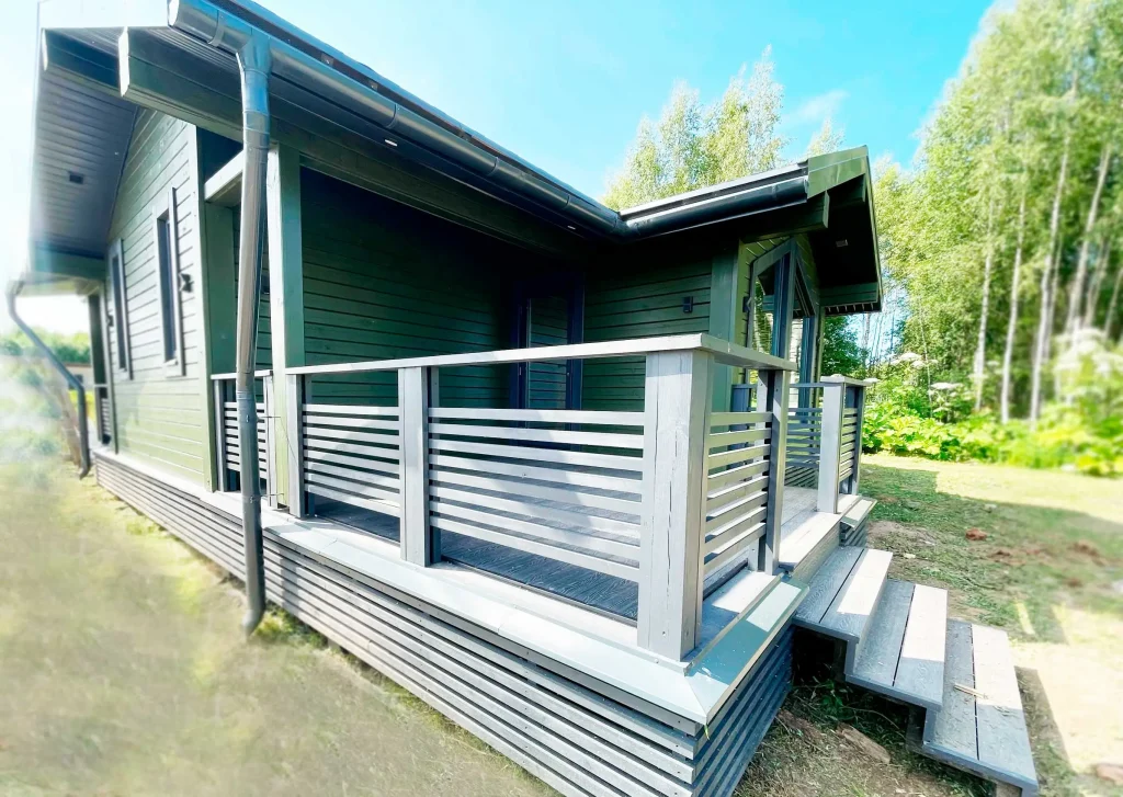 Построен одноэтажный дом с мансардой. Дом имеет современный дизайн с большими окнами, которые занимают почти всю площадь фасада. Это создает светлое и просторное пространство внутри