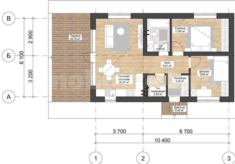 Размер: 10,4 х 6,1 м (без учета террасы)