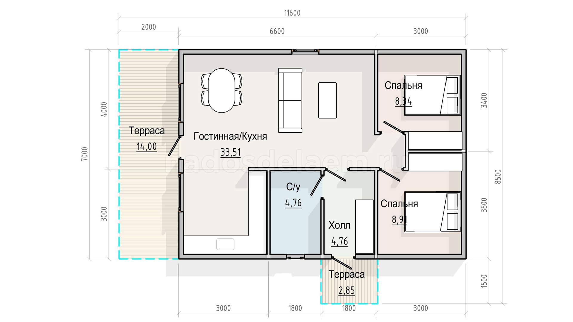 Этажей: 1 Размер: 11.6x7 м S общая: 77.13 кв.м Терраса: да Балкон: нет Крыльцо: да Эркер: нет Санузлов: 1 Спален: 2 Крыша: прямая Кукушка: нет 2 входа: да Топочная: нет Гараж: нет