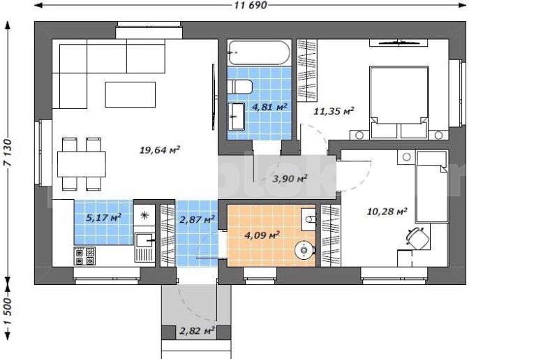 Входов: 2 (главный вход через крыльцо/тамбур и выход на террасу из кухни-гостиной)