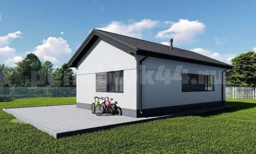 Этажность: 1 Размер: 10,78 х 8,88 м Общая площадь: 80,10 кв.м Терраса: да (площадь 14,00 кв.м) Крыльцо: да (площадь 2,25 кв.м) Эркер: нет Санузлов: 1 (площадь 4,80 кв.м) Спален: 2 (спальня 12,60 кв.м и детская 11,20 кв.м) Кровля: четырехскатная (вальмовая) Кукушка: нет Входов: 2 (главный вход через крыльцо/тамбур и выход на террасу из кухни-гостиной) Топочная: да (тех. помещение 4,40 кв.м) Гараж: нет Кухня-гостиная: 30,50 кв.м Холл: 10,10 кв.м Тамбур: 4,25 кв.м