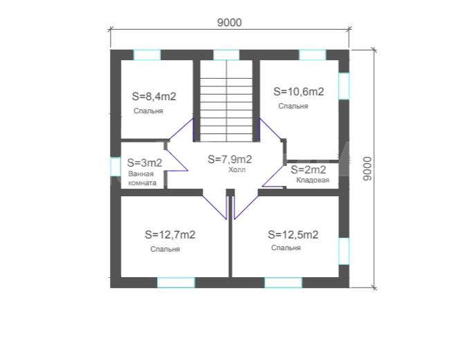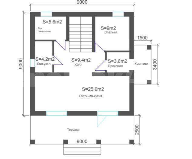 Входов: 2 (главный вход через крыльцо и выход на террасу из зоны кухни-гостиной)